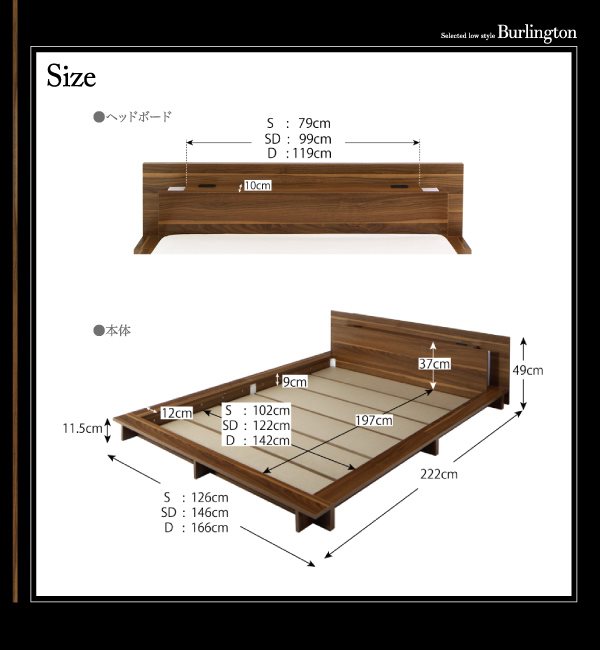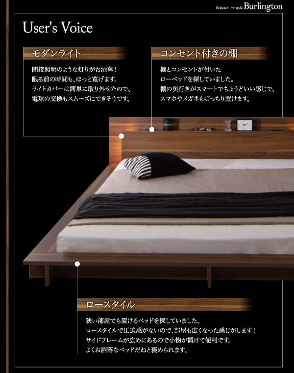 送料無料 モダンライト・コンセント付きローベッド セミダブル Burlington バーリントン スタンダードボンネルコイルマットレス付き フットライト付き ウォールナット セミダブルベッド フロアベッド ロースタイル 500024449